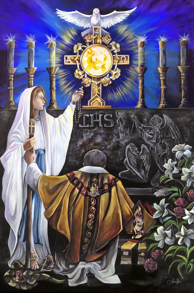 Mother Mary’s hand holds the Rosary while directing the Bishop to the Monstrance containing Jesus in the Sacred Host. For my non-Catholic friends, a monstrance is a sacred vessel, which holds the consecrated Eucharistic host of Jesus Christ. Catholic’s believe the consecrated Eucharist is truly the Body, Blood, Soul and Divinity of Jesus Christ. So the purpose of the monstrance (in Latin monstrare meaning “to show”) is to show or display the Eucharistic Jesus so we can adore and venerate Him.
